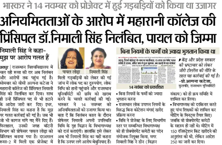 जयपुर। राजस्थान विश्वविद्यालय में अनियमितताओं के चलते महारानी कॉलेज की प्रिंसिपल डॉ. निमाली सिंह को निलंबित कर दिया गया है। उनके स्थान पर पायल लोधा को प्रभार सौंपा गया है। डॉ. निमाली सिंह पर आरोप है कि उन्होंने बिना नियमों के कई फर्मों को अधिक भुगतान किया, जिससे गड़बड़ियां सामने आईं।