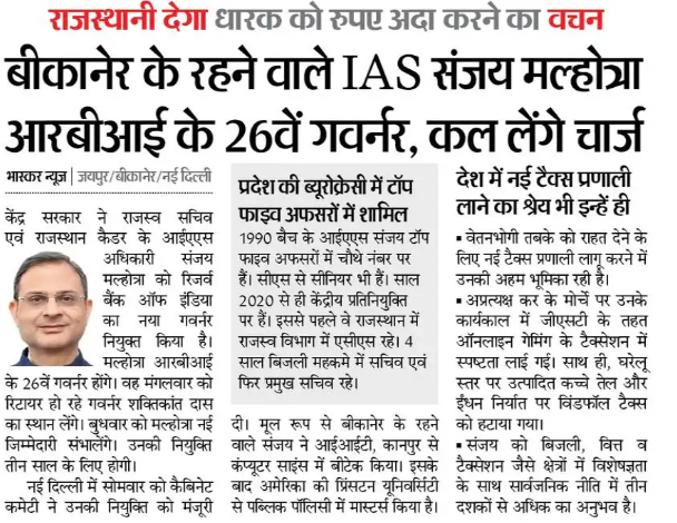 Read Moreनई दिल्ली। केंद्र सरकार ने राजस्व सचिव और राजस्थान कैडर के आईएएस अधिकारी संजय मल्होत्रा को भारतीय रिजर्व बैंक (आरबीआई) का नया गवर्नर नियुक्त किया है। वह मंगलवार को रिटायर हो रहे शक्तिकांत दास का स्थान लेंगे और बुधवार से अपनी नई जिम्मेदारी संभालेंगे।