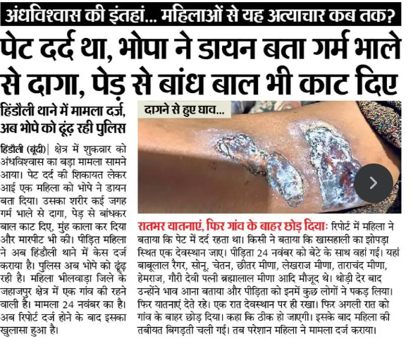 आधुनिक भारत में अन्धविश्वास का काला शाया, हिन्दोली में महिला को डायन बता गर्म चीमटे से पीटा