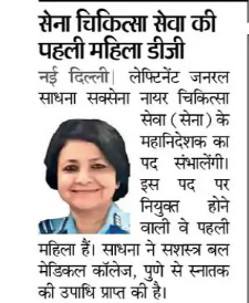 नई दिल्ली: सेना चिकित्सा सेवा (एएमएस) में एक महत्वपूर्ण कदम के रूप में, साधना सक्सेना को एएमएस की पहली महिला महानिदेशक (डीजी) नियुक्त किया गया है। यह नियुक्ति भारतीय सेना के चिकित्सा विभाग में लैंगिक समानता और महिलाओं के बढ़ते योगदान को दर्शाती है।