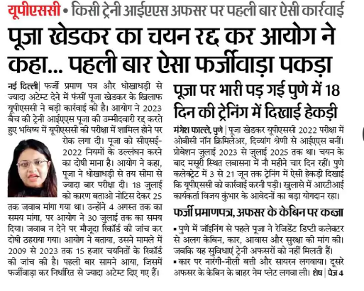 धोखाधड़ी का मामला: आयोग ने पूजा खेडकर के चयन को धोखाधड़ी के कारण रद्द कर दिया है। आयोग ने जांच के दौरान पाया ...