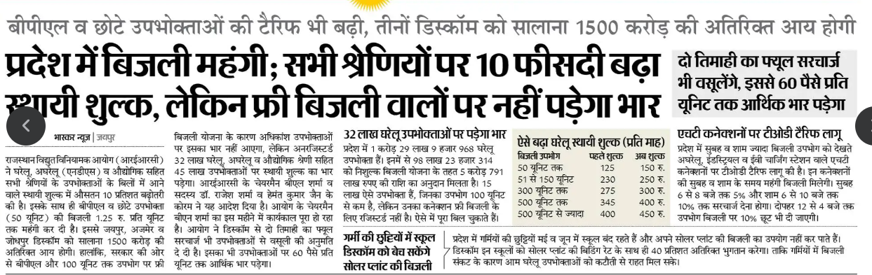 राजस्थान में जनता पर महंगाई की मार का असर और बढ़ गया है। हाल ही में बिजली के टैरिफ में एक बार फिर बढ़ोतरी की गई है। इस बढ़ोतरी से आम जनता की जेब पर भारी बोझ पड़ने की संभावना है।