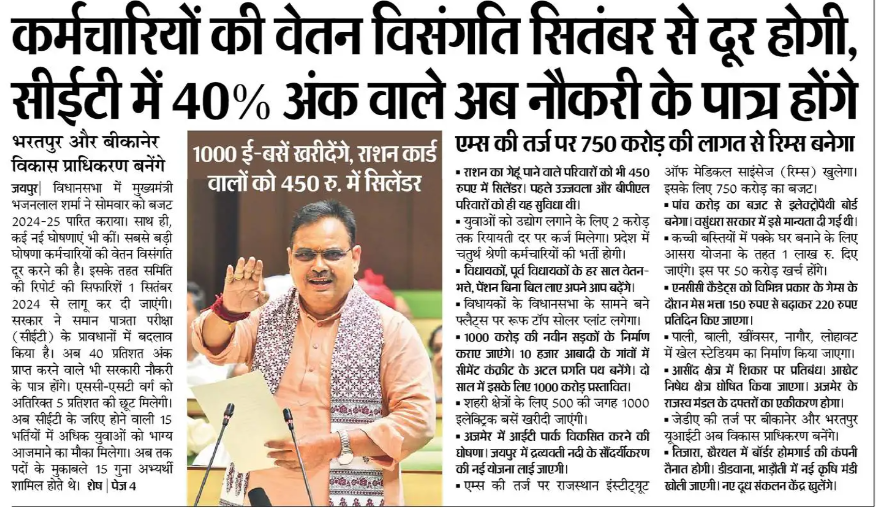 राजस्थान के मुख्यमंत्री ने विधान सभा में एक महत्वपूर्ण घोषणा की है। उन्होंने बताया कि कर्मचारियों की वेतन विसंगतियों को दूर करने के लिए विशेष कदम उठाए जाएंगे। साथ ही, सीईटी (कॉमन एलिजिबिलिटी टेस्ट) में 40% अंक लाने वाले उम्मीदवारों को पास घोषित किया जाएगा।