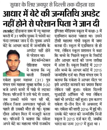 मामला जयपुर के पास स्थित एक छोटे से गांव का है, जहां 45 वर्षीय रमेश कुमार ने आत्महत्या कर ली। सूत्रों के अनुसार, रमेश अपने बेटे के स्कूल में दाखिले के लिए प्रयासरत थे, लेकिन आधार कार्ड में गलत जन्मतिथि होने के कारण स्कूल प्रशासन ने दाखिला देने से मना कर दिया।