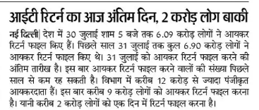 आयकर रिटर्न (आईटीआर) फाइल करने की अंतिम तिथि 31 जुलाई है। अगर आपने अभी तक अपना आईटीआर फाइल नहीं किया है, तो कृपया इसे जल्द से जल्द पूरा कर लें।