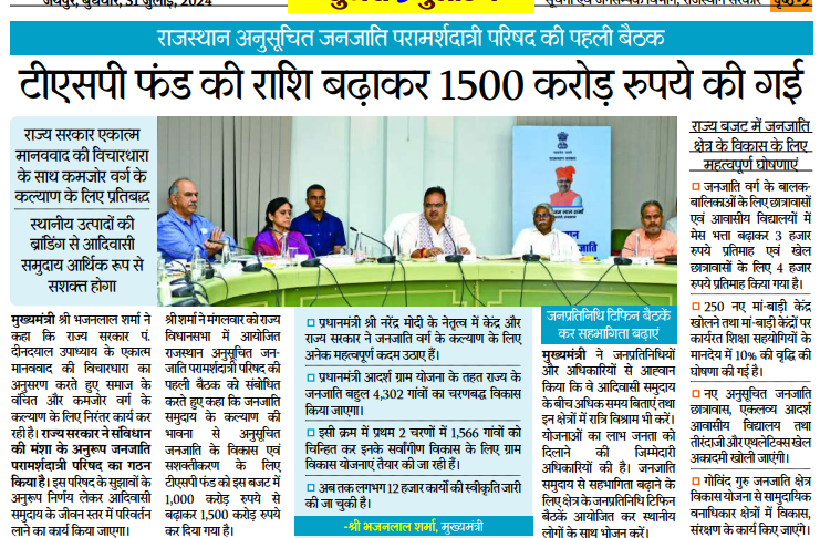 राजस्थान सरकार ने राज्य के जनजातीय उप-योजना (TSP) फंड को बढ़ाकर 1500 करोड़ रुपये कर दिया है। यह निर्णय जनजातीय क्षेत्रों के विकास को गति देने और उनकी समृद्धि सुनिश्चित करने के उद्देश्य से लिया गया है। सरकार के इस कदम से जनजातीय समुदायों की शिक्षा, स्वास्थ्य, बुनियादी ढांचे और रोजगार के क्षेत्रों में सुधार होने की उम्मीद है।
