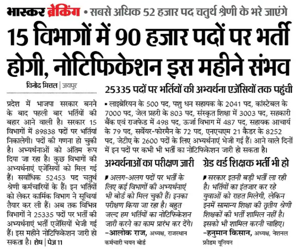 राजस्थान में भाजपा सरकार के कार्यकाल में पहली बार बड़े पैमाने पर भर्तियां होने जा रही हैं। सरकार 15 विभागों में कुल 89838 पदों पर भर्तियां निकालेगी। पदों की गणना पूरी हो चुकी है और अभ्यर्थनाओं को अंतिम रूप दिया जा रहा है।