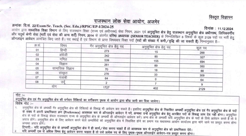 Read Moreराजस्थान लोक सेवा आयोग (RPSC) ने माध्यमिक शिक्षा विभाग के लिए 2129 वरिष्ठ अध्यापक (Senior Teacher) पदों पर भर्ती के लिए ऑनलाइन आवेदन आमंत्रित किए हैं। इन पदों पर भर्ती राजस्थान शिक्षा (राज्य एवं अधीनस्थ) सेवा नियम, 2021 और राजस्थान अनुसूचित क्षेत्र अधीनस्थ, लिपिकवर्गीय एवं चतुर्थ श्रेणी सेवा (भर्ती एवं सेवा की अन्य शर्तें) नियम, 2014 के तहत की जाएगी।