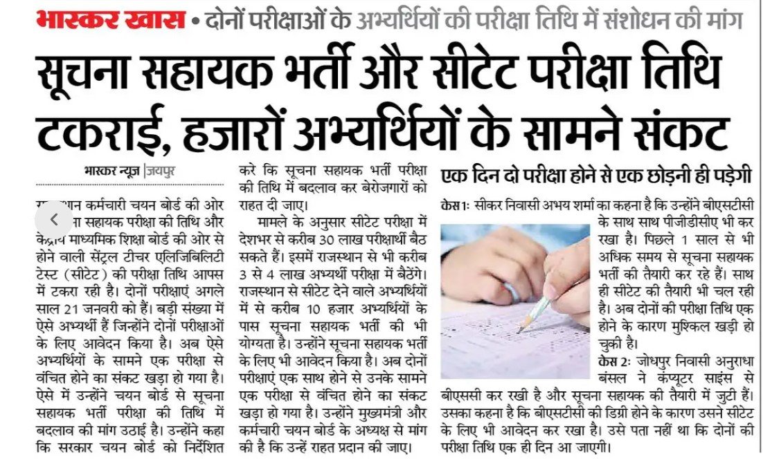 Read Moreसूचना सहायक और CTET की परीक्षा में टकराव .........अभ्यर्थियों ने की परीक्षा में बदलाव की मांग