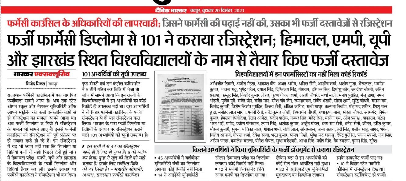 Read Moreराजस्थान में फार्मेसी रजिस्ट्रेशन में फर्जी डिप्लोमा /डिग्री में पाई गई अनियमितता
