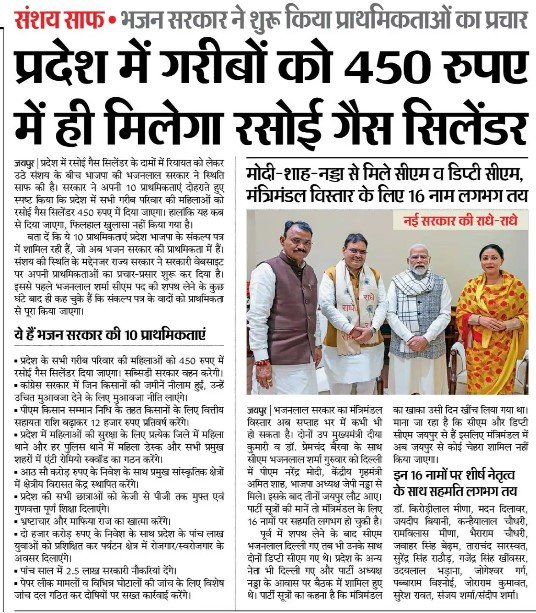 Read Moreनए साल पर राजस्थान को मिला मंत्री मंडल कुल 22 मंत्रियो ने शपथ ली है जिसमे हर वर्ग का ध्यान रखा गया है वरिष्ठ एवं नए चहरे का समन्वय देखने को मिला है सर्वाधिक मंत्री OBC समुदाय से बनाये गए है | सुरेन्द्र सिंह टीटी को पहले ही मंत्री बनाया गया है ताकि करनपुर सीट को निकाला जा सके | अब मुख्यमंत्री सहित कुल 25 मंत्री बन चुके है अभी भी 5 मंत्री और बनाये जा सकते है सरकार का हाले आलम जाने तो एक महीने में मंत्री मंडल का गठन हुआ है सारे काम ठप्प पड़े हुए है देखने वाली बात ये होगी क्या पिछली सरकार की जनकल्याण कारी योजनाओ को भी अभी जारी रखा जायेगी या बंद कर दी जाएगी जिस तरह के वाडे सरकार ने किये है उन्हें पूरा कर पाना एक आशान नहीं है सरकार के लिए | दूसरा एक नए चहरे को मुख्यमंत्री बना कर केंद्र ने अपनी पकड़ राज्य पर मजबूत कर ली है पर क्या अपने निर्णय ले पाएंगे भजन लाल जी या फिर केंद्र की कटपुत...