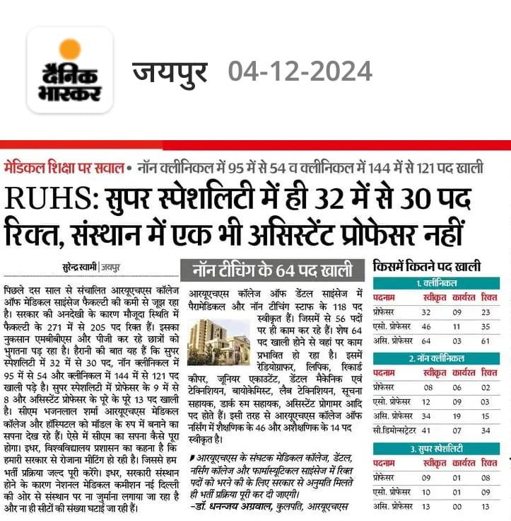 जयपुर: राजस्थान यूनिवर्सिटी ऑफ हेल्थ साइंसेज (RUHS) मेडिकल कॉलेज में स्टाफ की भारी कमी के चलते मरीजों को समय पर चिकित्सा सेवाएं नहीं मिल पा रही हैं। कॉलेज के प्रशासन और मरीजों के परिजनों का कहना है कि राज्य सरकार की ओर से इस मुद्दे पर ध्यान नहीं दिया जा रहा है, जिससे स्थिति दिन-प्रतिदिन बिगड़ती जा रही है।