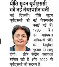 प्रीति सुदन, एक प्रतिष्ठित आईएएस अधिकारी, को संघ लोक सेवा आयोग (UPSC) का नया चेयरमैन नियुक्त किया गया है। उनकी नियुक्ति से UPSC को उनके अनुभव और विशेषज्ञता का लाभ मिलेगा।
