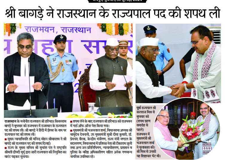 राजस्थान के नए राज्यपाल के रूप में श्री बागडे ने शपथ ग्रहण की है। शपथ ग्रहण समारोह जयपुर के राजभवन में आयोजित किया गया, जिसमें राज्य के प्रमुख नेताओं और गणमान्य व्यक्तियों ने हिस्सा लिया।