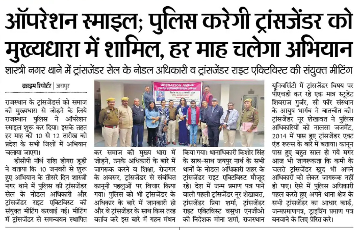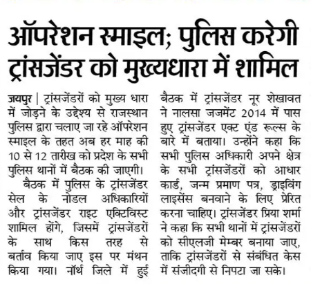 Read Moreऑपरेशन स्माइल : पुलिस विभाग बदलेगा ट्रांसजेंडर की किस्मत : जयपुर में हुए सम्मलेन में नूर शेखावत और दीप्ती शर्मा ट्रांसजेंडर ने अपने विचार रखे तथा सभी को मुख्य धारा में लाने हेतु अपने अनुभव को शेयर किया |