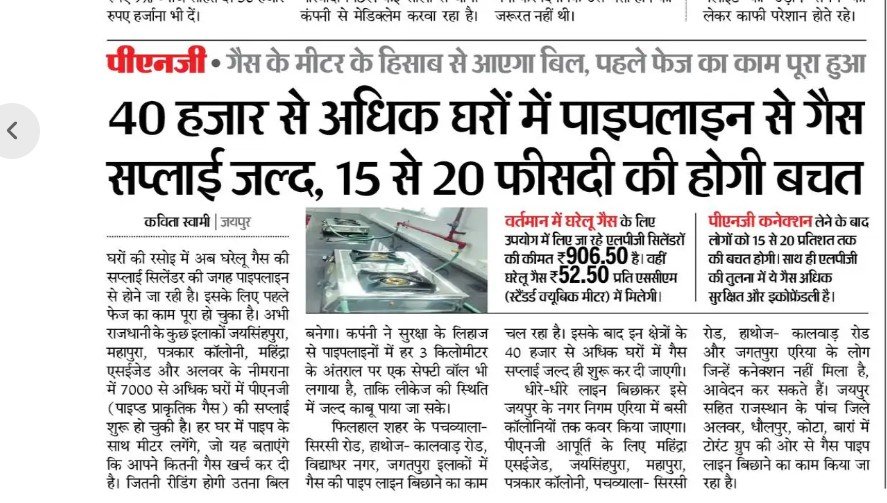 राजस्थान के जयपुर शहर में गैस पाइप लाइन सेवा प्रारम्भ
