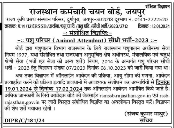 Read Moreपशु परिचर सीधी भर्ती हेतु आवेदन दिन्नाक 19 जनवरी , 2024 से प्रारम्भ