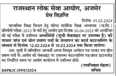 Read MoreRPSC PTI दस्तावेज सत्यापन 12 से 15 फरवरी तक किये जायेंगे