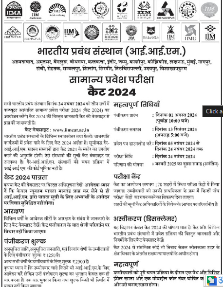 Read Moreकैट प्रवेश परीक्षा 2024: ऑनलाइन आवेदन 1 अगस्त से प्रारम्भ कॉमन एडमिशन टेस्ट (कैट) 2024 के लिए ऑनलाइन आवेदन प्रक्रिया 1 अगस्त से प्रारम्भ होगी। यह परीक्षा भारत के प्रमुख मैनेजमेंट संस्थानों में प्रवेश के लिए आयोजित की जाती है। महत्वपूर्ण तिथियाँ: ऑनलाइन आवेदन प्रारम्भ: 1 अगस्त 2024 ऑनलाइन आवेदन समाप्त: 15 सितंबर 2024 परीक्षा तिथि: 28 नवंबर 2024 आवेदन प्रक्रिया: उम्मीदवार आधिकारिक वेबसाइट पर जाकर ऑनलाइन आवेदन करेंगे। आवश्यक दस्तावेज़ और जानकारी भरनी होगी। आवेदन शुल्क का भुगतान करना होगा। आवेदन पत्र जमा करने के बाद, प्रिंटआउट लेना होगा। योग्यता और पात्रता: उम्मीदवार के पास किसी मान्यता प्राप्त विश्वविद्यालय से स्नातक की डिग्री होनी चाहिए। सामान्य श्रेणी के उम्मीदवारों को कम से कम 50% अंक प्राप्त करने होंगे। आरक्षित श्रेणी के उम्मीदवारों को कम से कम 45% अंक प्राप्त करने ह...