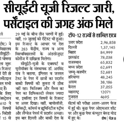 Read Moreकेंद्रीय विश्वविद्यालय प्रवेश परीक्षा (CUET) 2024 का परिणाम घोषित कर दिया गया है। छात्र अब आधिकारिक वेबसाइट पर जाकर अपना रिजल्ट देख सकते हैं। इस साल की परीक्षा में देशभर से लाखों छात्रों ने हिस्सा लिया था, और परिणाम का इंतजार कर रहे थे। CUET 2024 के परिणाम को लेकर छात्रों में भारी उत्साह और उत्सुकता थी। परीक्षा के परिणाम के साथ ही छात्रों की रैंक और स्कोरकार्ड भी जारी कर दिए गए हैं। परिणाम देखने के लिए छात्रों को अपने रोल नंबर और अन्य आवश्यक जानकारी वेबसाइट पर दर्ज करनी होगी। NTA (नेशनल टेस्टिंग एजेंसी) ने परीक्षा का आयोजन किया था और यह सुनिश्चित किया कि परीक्षा प्रक्रिया सुचारू और पारदर्शी रहे। परिणामों की घोषणा के बाद अब छात्रों को उनके पसंदीदा केंद्रीय विश्वविद्यालयों में दाखिले की प्रक्रिया शुरू होगी। रिजल्ट चेक करने के लिए छात्रों को निम्नलिखित कदम उठाने हों...