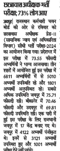 जयपुर: छात्रावास अधीक्षक -2024 की परीक्षा में 73% प्रतिभागियों ने अपनी किस्मत आजमाई है। इस साल की परीक्षा में अभ्यर्थियों की संख्या में उल्लेखनीय वृद्धि देखी गई है, जो इस पद के लिए बढ़ते हुए आकर्षण को दर्शाता है। परीक्षा का आयोजन राज्य सरकार द्वारा किया गया था, और इसे राज्य के विभिन्न केंद्रों पर सुचारू रूप से संपन्न कराया गया। अधिकारियों के अनुसार, परीक्षा में शामिल होने वाले अभ्यर्थियों की संख्या इस बार पिछले वर्षों की तुलना में अधिक रही, जिससे प्रतियोगिता का स्तर भी बढ़ गया है। छात्रावास अधीक्षक पद के लिए आयोजित इस परीक्षा में कुल मिलाकर 73% प्रतिभागियों ने उपस्थिति दर्ज कराई। परीक्षा के आयोजन के लिए व्यापक तैयारियां की गई थीं, जिससे सभी प्रतिभागियों को एक समान और पारदर्शी अवसर मिल सके। परीक्षा में शामिल हुए प्रतिभागियों के प्रदर्शन के आधार पर जल्द ही पर...