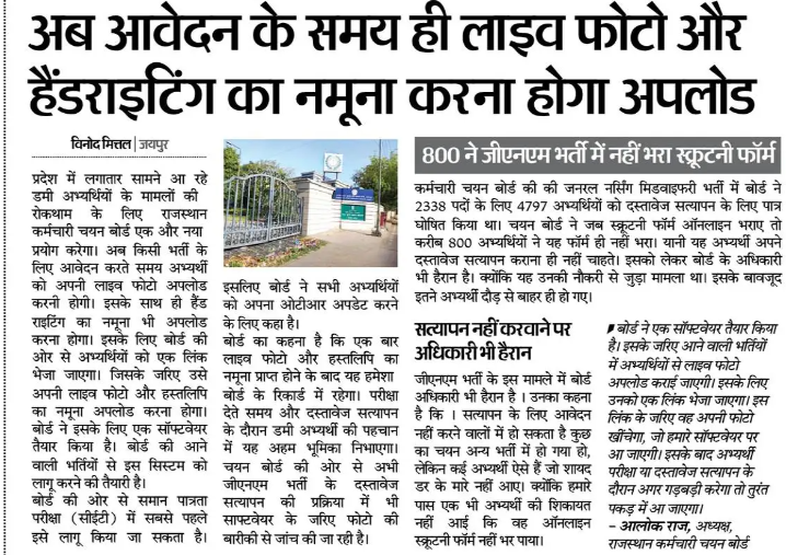 राजस्थान कर्मचारी बोर्ड ने आवेदन प्रक्रिया में एक महत्वपूर्ण नवाचार की घोषणा की है। अब उम्मीदवारों को आवेदन करते समय लाइव फोटो अपलोड करना अनिवार्य होगा। यह कदम आवेदन प्रक्रिया को अधिक पारदर्शी और सुरक्षित बनाने के उद्देश्य से उठाया गया है।
